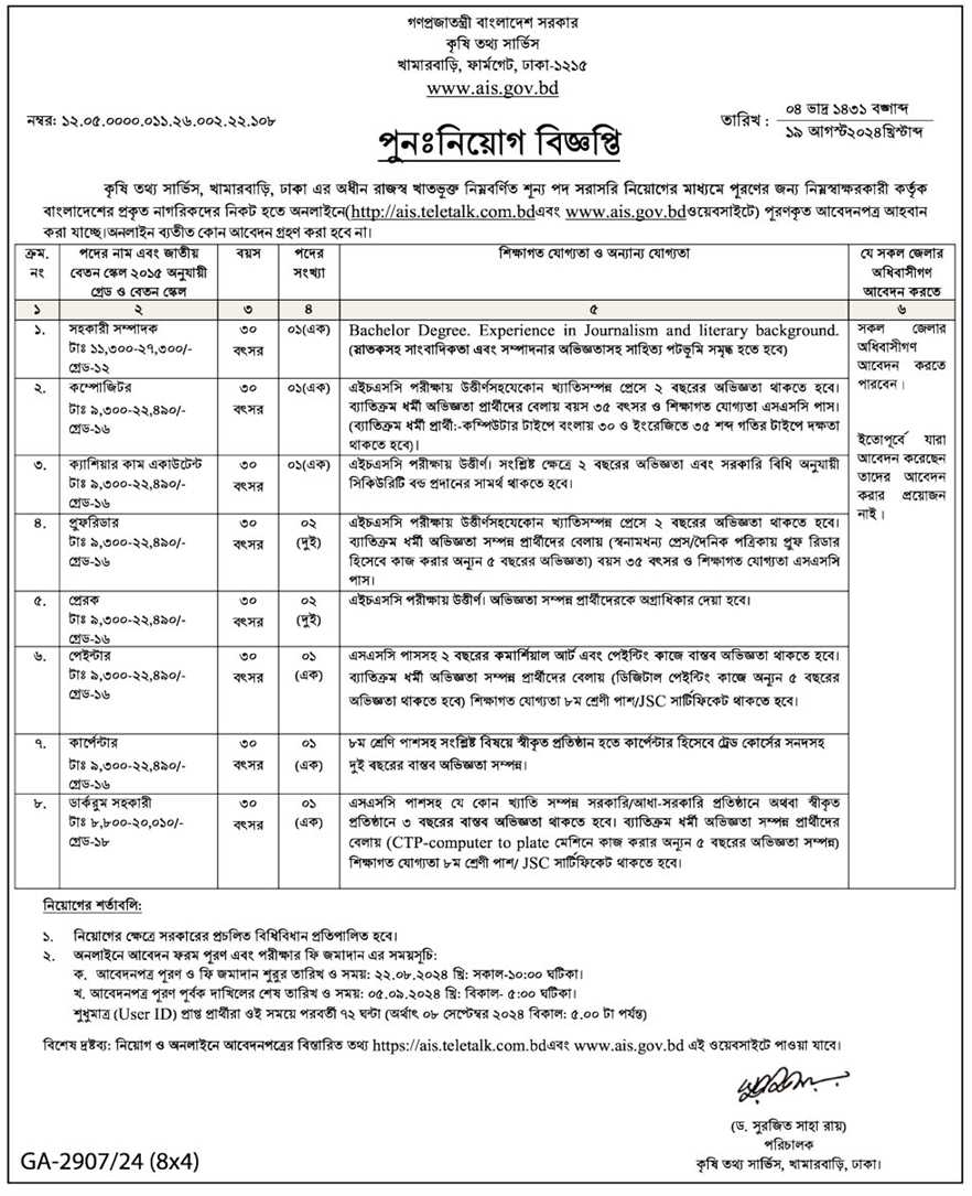 AIS teletalk Application published by www.ejobsresults.com not only circular but also Agriculture Information Service job result, seat plan, exam question solution, and apply instructions also. AIS is a government organization. If you are interested in the AIS teletalk Application in Bangladesh, it may the best govt. circular for you. Please check full description of AIS teletalk Application. Only eligible can apply this Agriculture Information Service http://ais.teletalk.com.bd before 05, September 2024.