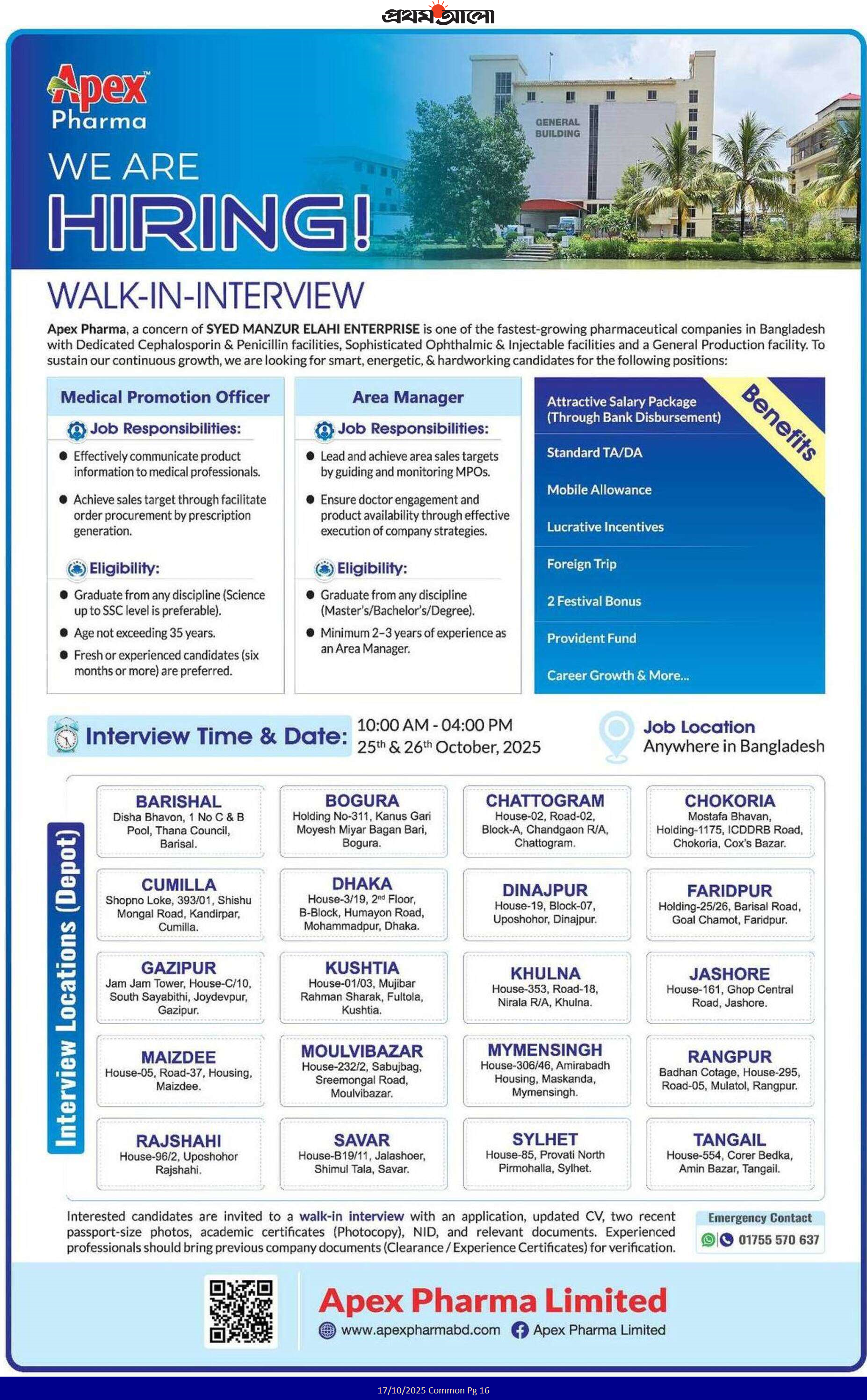 Applying for a job at Apex Pharma Ltd is very simple. Candidates need to bring all educational certificates, both original and photocopies, along with two recent passport-size color photographs. Interested applicants should attend a walk-in interview with their CV, certificates, photos, and national ID card. You can also send your CV to the company’s address: Apex Pharma Ltd, House #06, Road #137, Block #SE (D), Gulshan, Dhaka-1212. For more information or help, visit the official website at www.apexpharmabd.com.