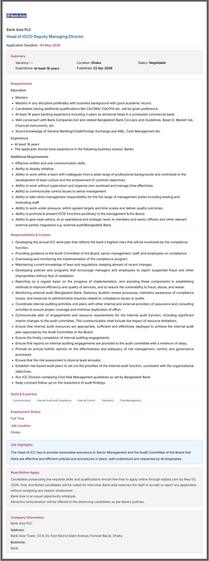 The Bank Asia Limited Job Circular 2026 lists clear education requirements for each position. Candidates must have the right degree and skills to apply. Some jobs may need experience, while others are open to fresh graduates. Read the circular carefully and check if you meet all the requirements before you apply.