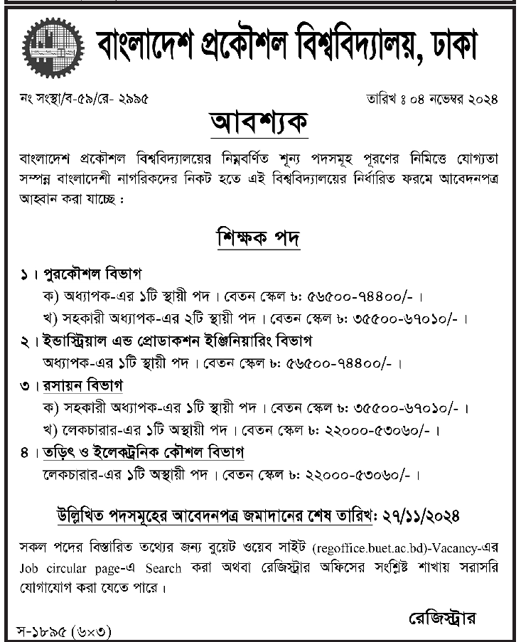 Bangladesh University of Engineering and Technology Job Circular 2024 was published for jobless people in Bangladesh. BUET offers new job vacancies daily online job portal, our website is collected and published by ejobsresults.com.