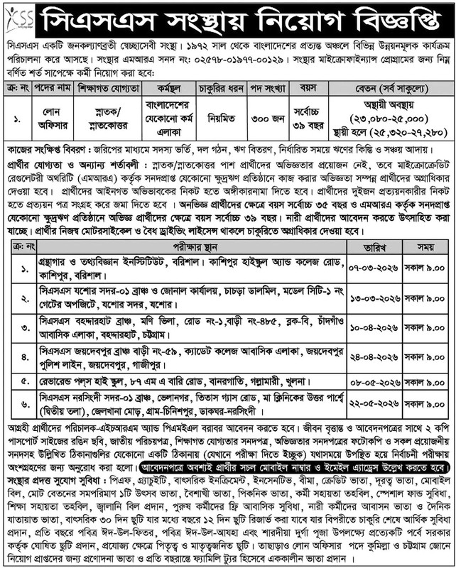 Christian Service Society (CSS) NGO Job Circular 2026 visit the official website of the Christian Service Society or refer to reliable sources such as online job portals, newspapers, or the CSS NGO’s official social media channels.