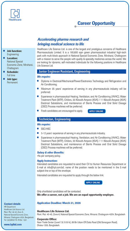 The job candidate can apply online, by email, and the head office address location is used for this pharma job. Only eligible candidates need to bring a detailed document with their application documents. Healthcare Pharmaceuticals Limited Job Circular 2026 apply link here-