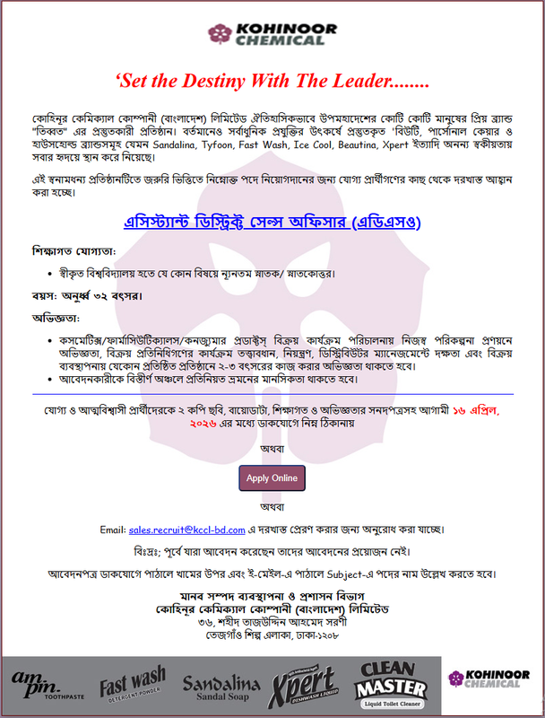 Kohinoor Chemical Company, Y Bangladesh Limited Job Circular Apply Process 2026