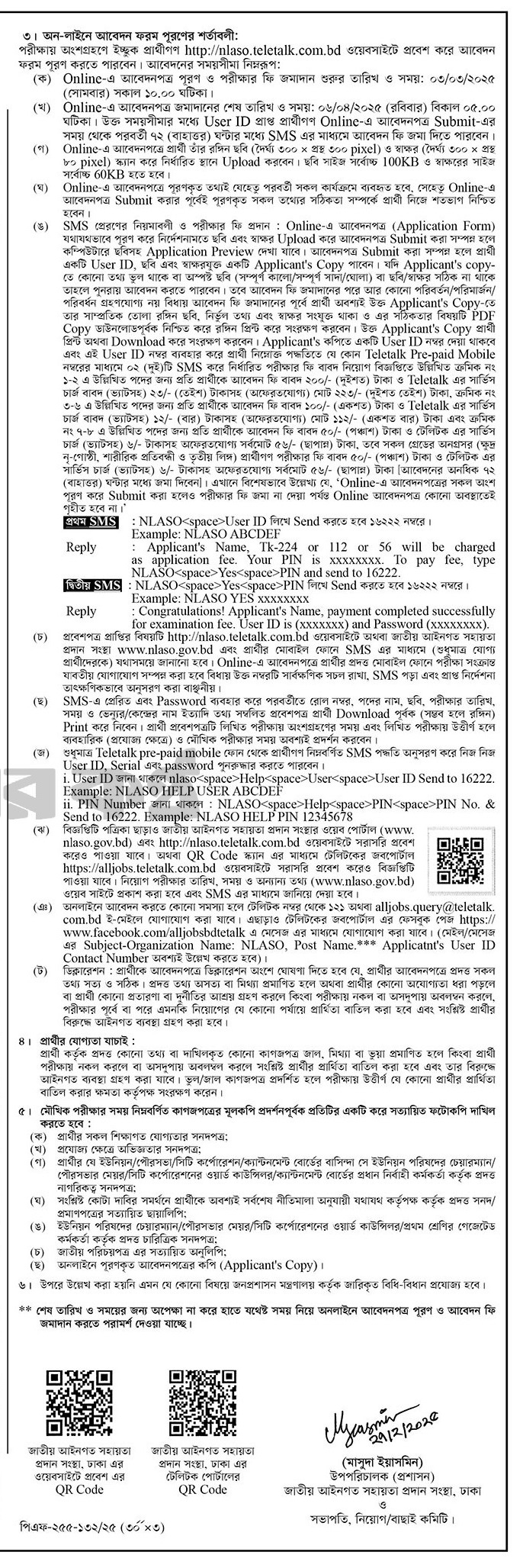 When you have got LJD Reply SMS: Applicant’s Name, Tk. 56 – 112 will be charged as an application fee. Your PIN is (8 digit number) 12345678.