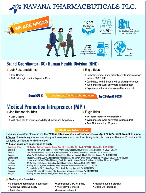 Eligible candidates are invited to apply with a recent passport size photograph, Complete CV, Handwritten application, NID copy, All-Academic certificates copy, Experience certificate (If applicable) to HRD of Navana Pharmaceuticals Limited, House # 99, Road # 4, Block # B, Banani, Dhaka-1213 by Deadline.