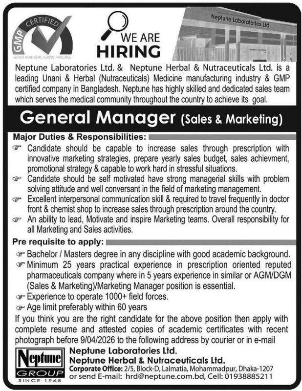 If you are an eligible person for Neptune Laboratories who is confident to work under pressure, self-motivated, dynamic & energetic may send your CV along with a copy of your national ID & recent photo.