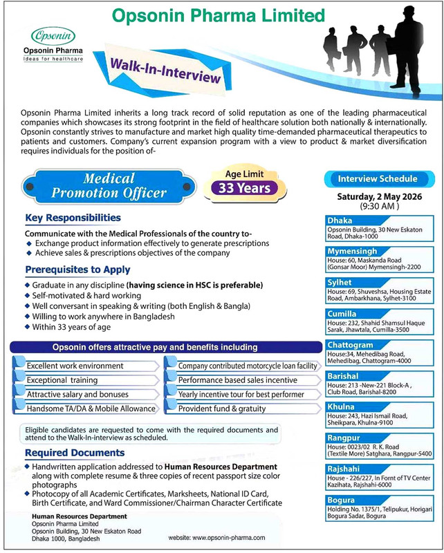 Opsonin Pharma Limited provided an attractive salary package, social respect, and fast career growth. The job interview for the available positions is scheduled for 02 May 2026.