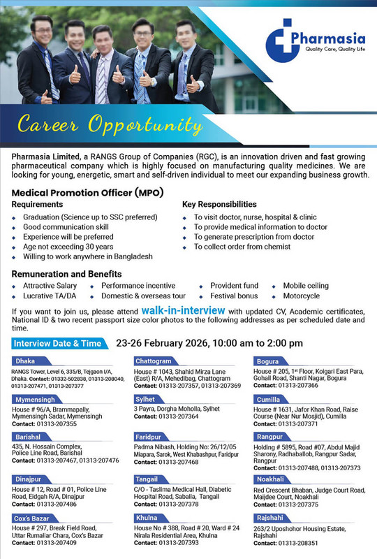 Moreover, Pharmacia Pharmaceuticals Ltd Bangladesh open a new medical officer job circular 2026 for the medical pass job circular eligible candidates in Bangladesh. So if you eligible then apply soon.