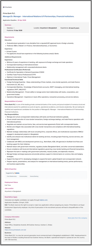 In summary, you are the most honorable visitor of the Prime Bank PLC circular 2026 post. If you think Prime Bank PLC recruitment post is a helpful post please bookmark our site. Other ways click the like or share button prime bank online application form. Thanks for staying the ejobsresults.com Prime Bank PLC job circular 2026 post.