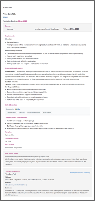 Online Apply Link : https://career.primebank.com.bd/career/joblist.html