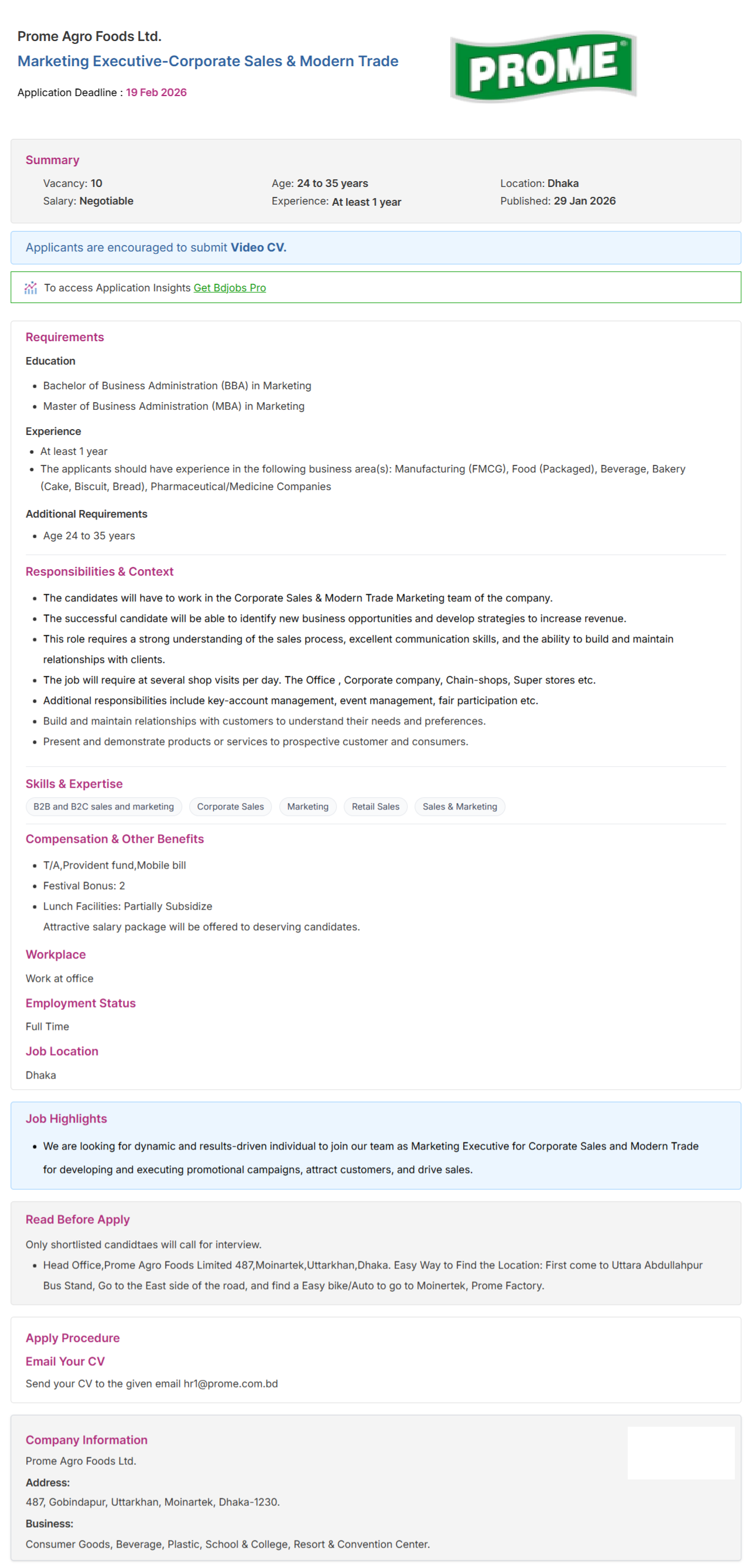 Candidates can visit the official website of Prome Agro Foods at https://www.prome.com.bd for more information. Applicants must submit their applications before the deadline. To understand the job requirements, candidates can view the job circular image and download the PDF file. They can save the notification and check it anytime.