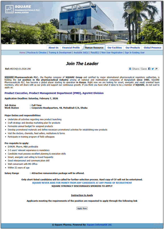 Apply Online Now: http://career.squarepharma.com.bd