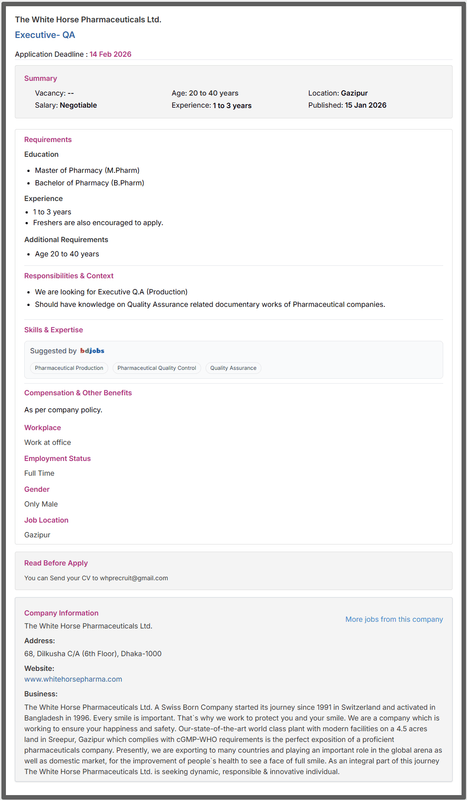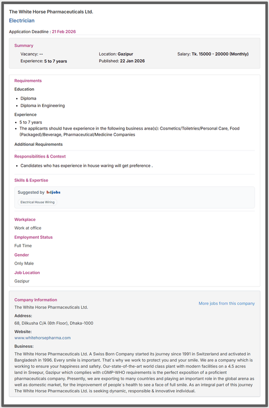 Recently, while inaugurated their State-of-the-Art world-class Pharmaceuticals Plant at Sreepur, Gazipur to meet UK-MHRA as well as US-FDA standards to facilitate export to western countries. People also search white horse pharma product list 2026. The candidate also finds what job circular full summary of the job circular below.